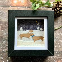 This cute snowy dachshund frame makes a cute Christmas decoration OR you could keep it up all year!! They feature two dachshunds, complete with sparkly collars, rubbing noses amongst the sparkly snow, some snowy trees with a simple silvery moon and yellow star in the distance, the design is completed with two tiny red hearts.
