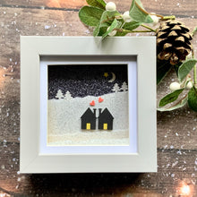 This gorgeous sparkly mini frame has two little houses set amongst the crisp snow with two tiny red hearts coming from the chimneys. The sky is a pretty inky blue which also sparkles and it has a lovely silvery moon and yellow star. Finished off with some sparkly snowy trees, it makes the perfect little Chrisrmas present or decoration.