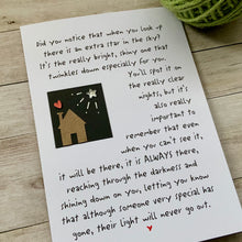 Did you notice that when you look up there is an extra star in the sky? It's the really bright, shiny one that twinkles down especially for you. You'll spot it on the really clear nights, but it's also really important to remember that even when you can't see it, it will be there, it is always there, reaching through the darkness and shining down on you, letting you know that although someone very special has gone, their light will never go out.