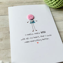 This simple card has a button person holding a broken heart together. Sometimes when someone you care about is going through a tough time it's hard to find the right thing to say, this card says just enough and lets them know you are thinking of them.