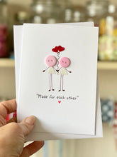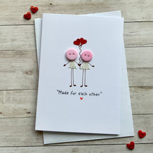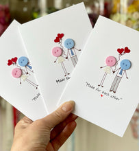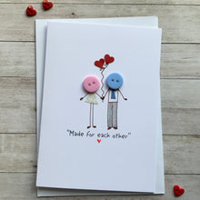 This cute button couple card is perfect for weddings, engagements or anniversaries and features the happy couple holding a couple of red heart balloons and the wording: